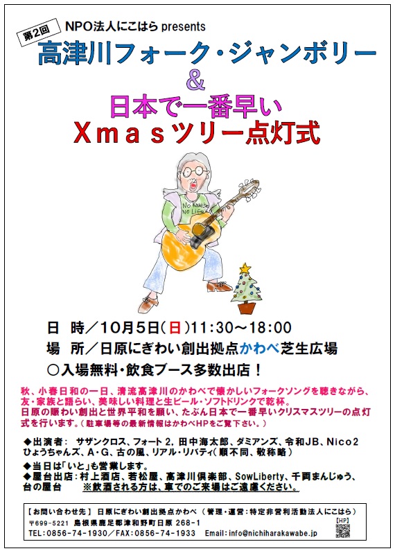 10月5日(日)、日原にぎわい創出拠点「わかべ」芝生広場において「高津川フォークジャンボリー&日本で一番早いXマスツリー点灯式」、10月13日(月:スポーツの日)、津和野本町通りにて「つわの本町えびす講まつり」が開催されます。ぜひお越しください!